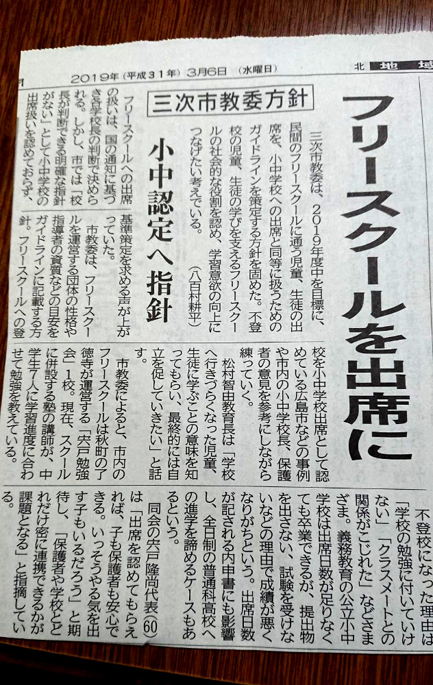 教育機会確保法の施行に従ってフリースクールに通うことが出席扱いになるよう、